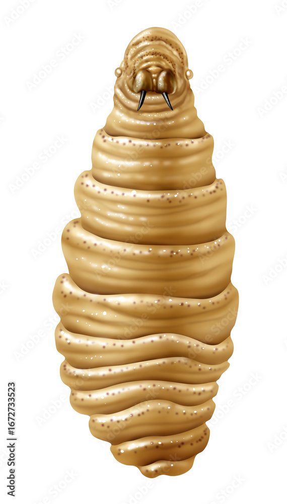 Screwworm larva as a Parasite outbreat or epidemic as flesh-eating larvae Infectious disease and public health issue as a vetirinary medicine concept on a white background. #1672733523