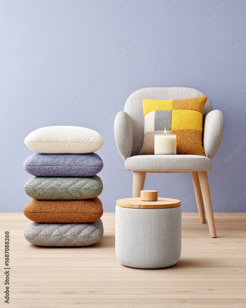 Serene Interior Scene with Stacked Pillows, Armchair, Candle, and Ceramic Jar against a Pale Purple Wall - Soft Lighting, Minimalist Style #1687088260