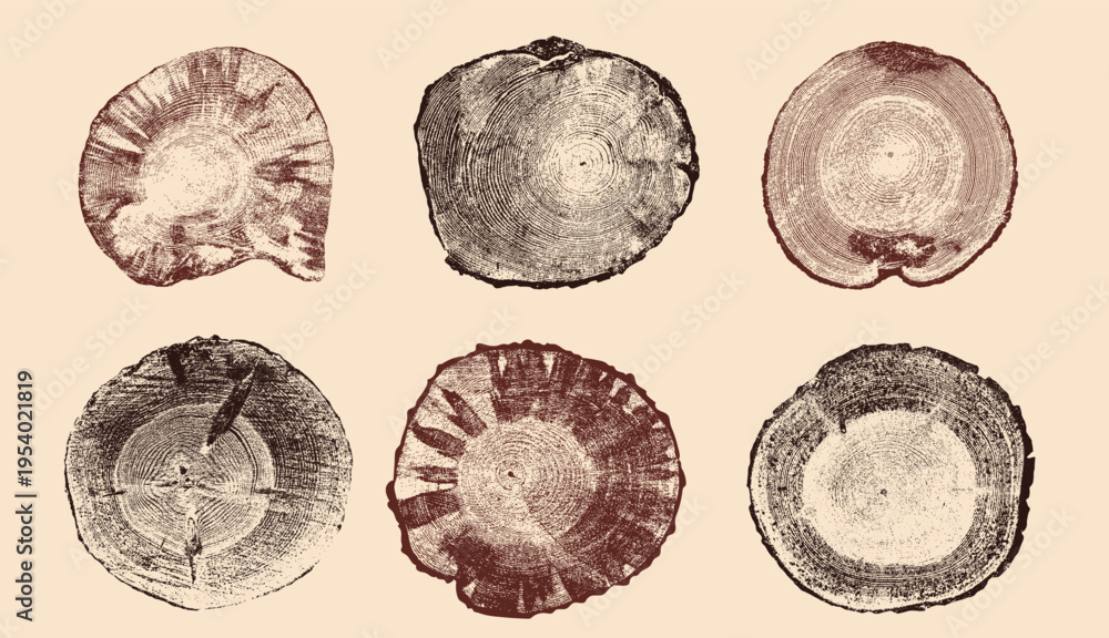 Set of brown tree ring cross sections, wood slices isolated. Tree stump cuts with natural growth rings, trunk slabs, detailed ring patterns. Organic wood texture elements for background design. #1954021819
