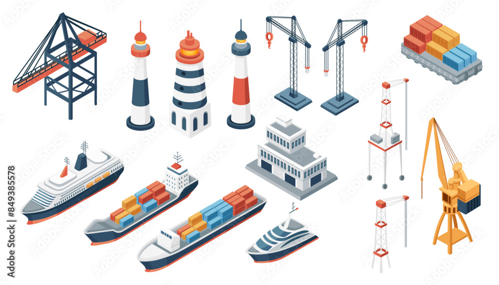 Set of 2d isometric illustration of maritime transportation industry or commercial port warehouse theme vector illustration isolated on white background #849385578