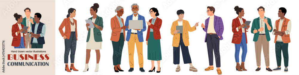Set of diverse casual business people talking and interacting. Business communication concept in flat, modern style with clean lines, professional aesthetic. Vector isolated on transparent background #1764213776