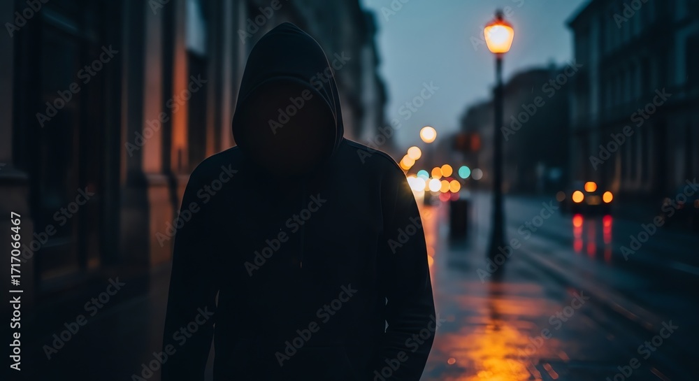 Shadowed Enigma: A Faceless Hooded Figure on a Glistening, Rain-Soaked City Street. #1717066467