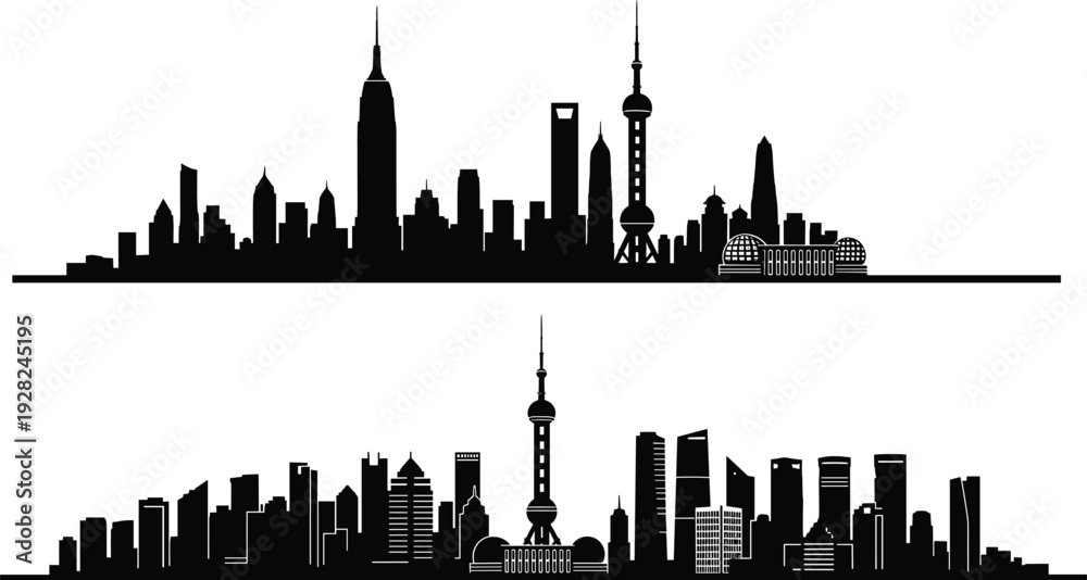Shanghai city skyline silhouette vector illustration, modern urban skyscrapers panorama with Oriental Pearl Tower, black and white architectural cityscape design #1928245195
