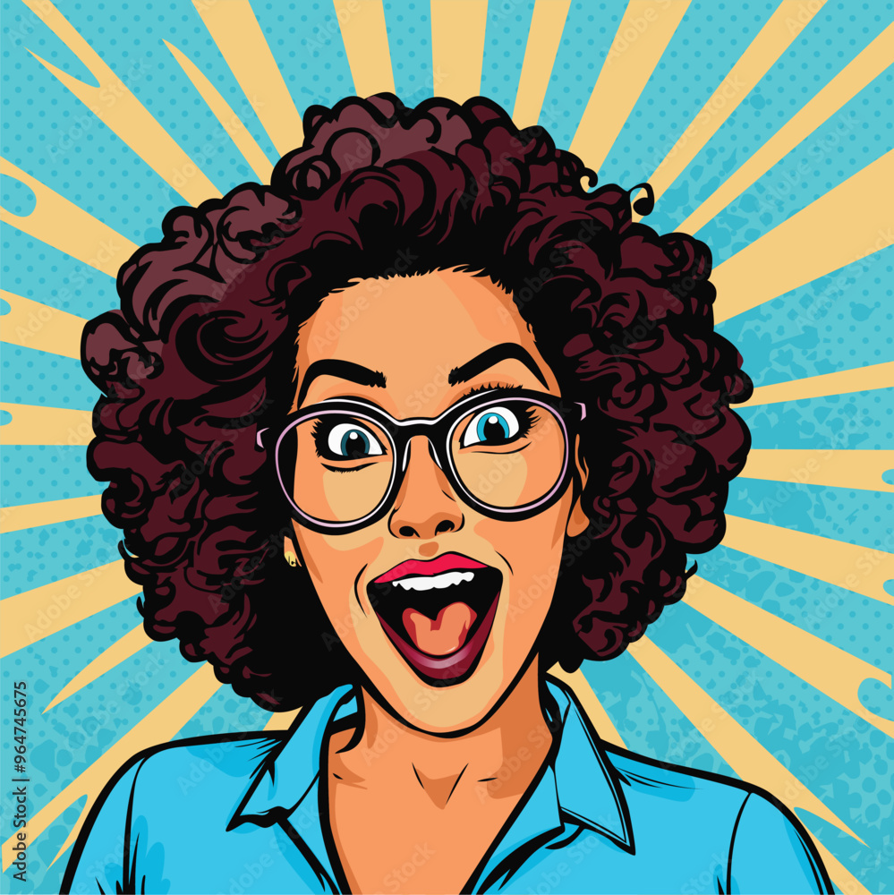 Shocked, surprised african american young girl. Unbelievable news, big sale concept in pop art retro comic style #964745675