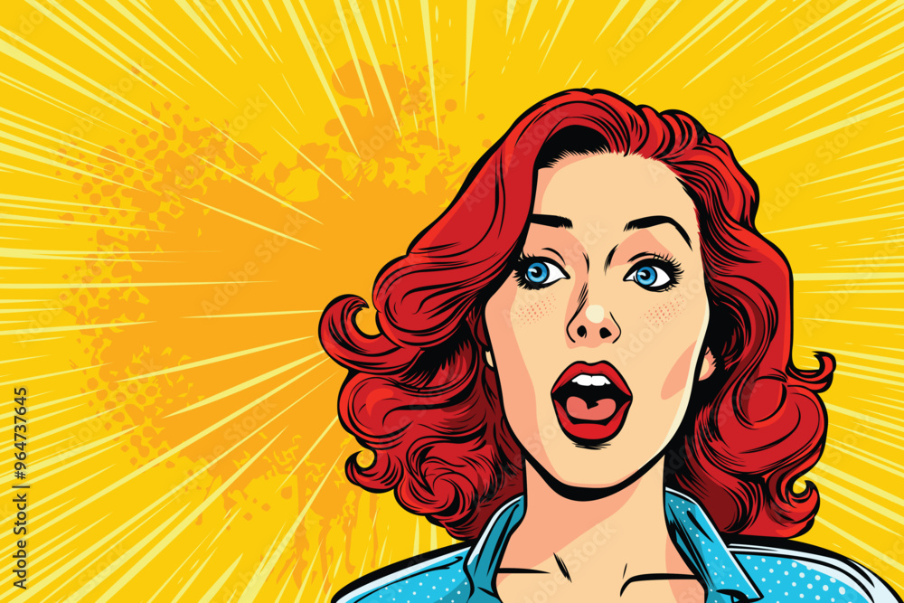 Shocked, surprised caucasian young girl. Unbelievable news, big sale concept in pop art retro comic style #964737645