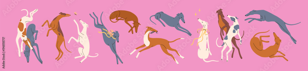 Sighthound, greyhound and whippet, canine animal breeds. Cute slender elegant graceful thin dogs in movement, dynamic poses. Puppy pets running, sleeping, playing. Isolated flat vector illustrations #1968118717
