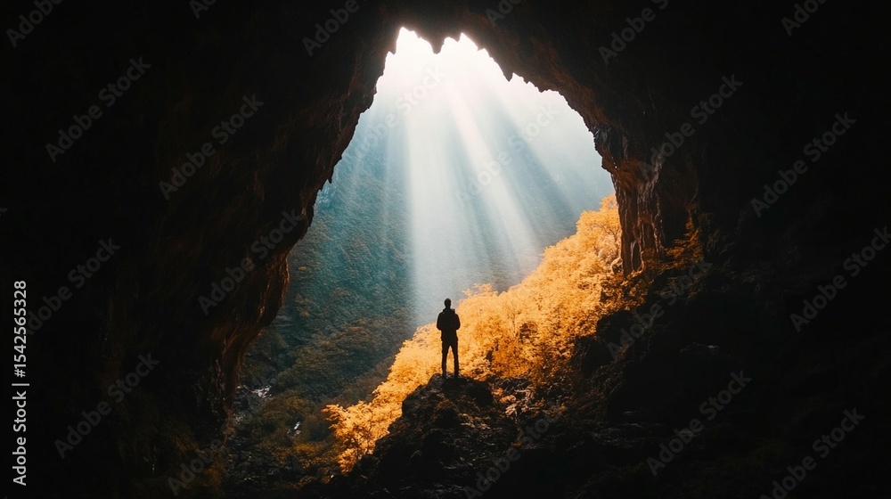 Silhouette figure stands in cave entrance, bathed in sunlight #1542565328