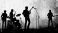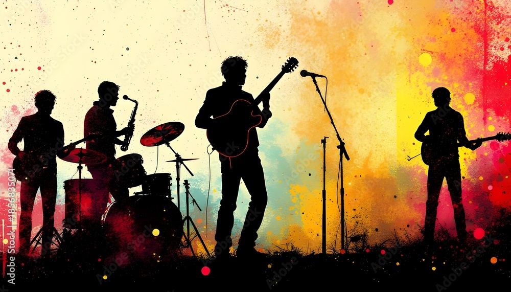 Silhouette of a musical band performing on a colorful abstract background with vibrant paint splatters and artistic watercolor textures. #1856835071