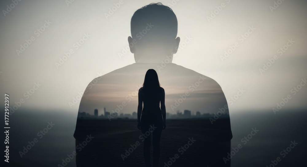 Silhouette Of People Against Cityscape - Silhouette of a person standing, layered with a larger silhouette, cityscape in background. The background is a gradient #1772912397