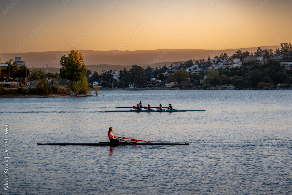 Silhouette of people enjoying rowing on Saint Roque Lake in Villa Carlos Paz at sunset #922502968