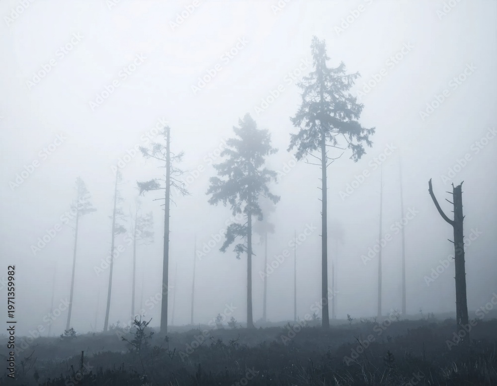 Silhouetted pine trees in a dense foggy forest during twilight, moody atmosphere for mystery and nature themes, serene stillness and quiet solitude #1971359982