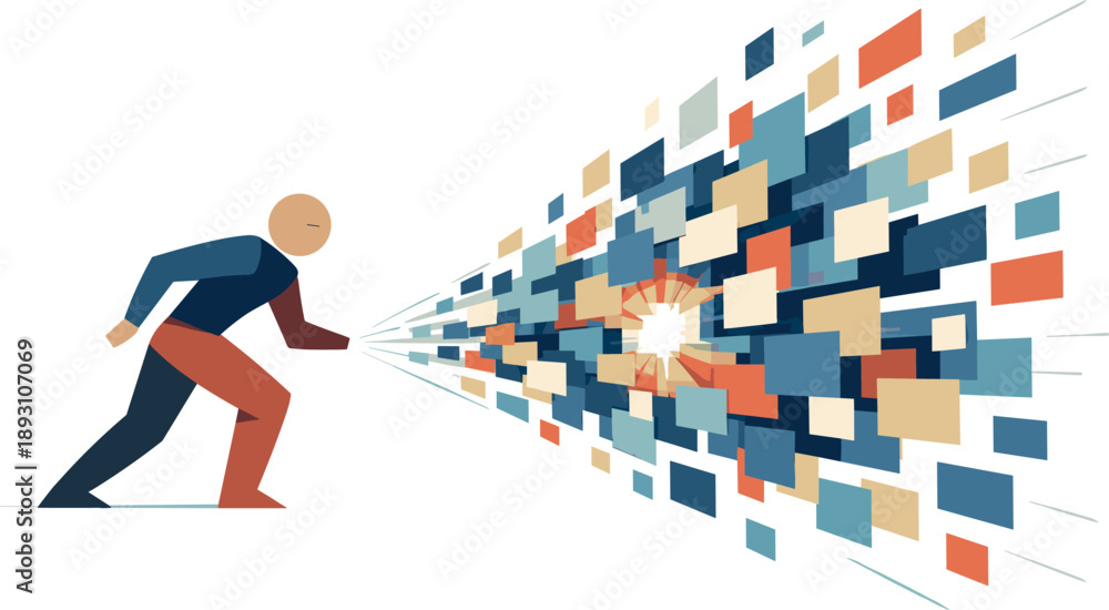 Single abstract geometric human figure leans as data blocks multiply and accelerate toward center conveying #1893107069