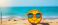 Sliced orange wearing sunglasses on a summer sandy beach with sea in the background #748198121