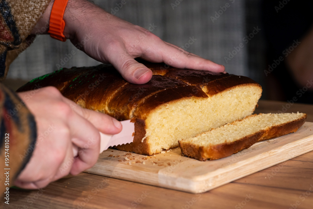 Slicing a fresh loaf of fluffy golden bread #1957481032