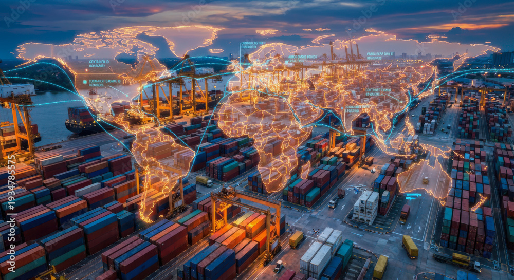 Smart global logistics port with glowing holographic world map interface at night #1934785575