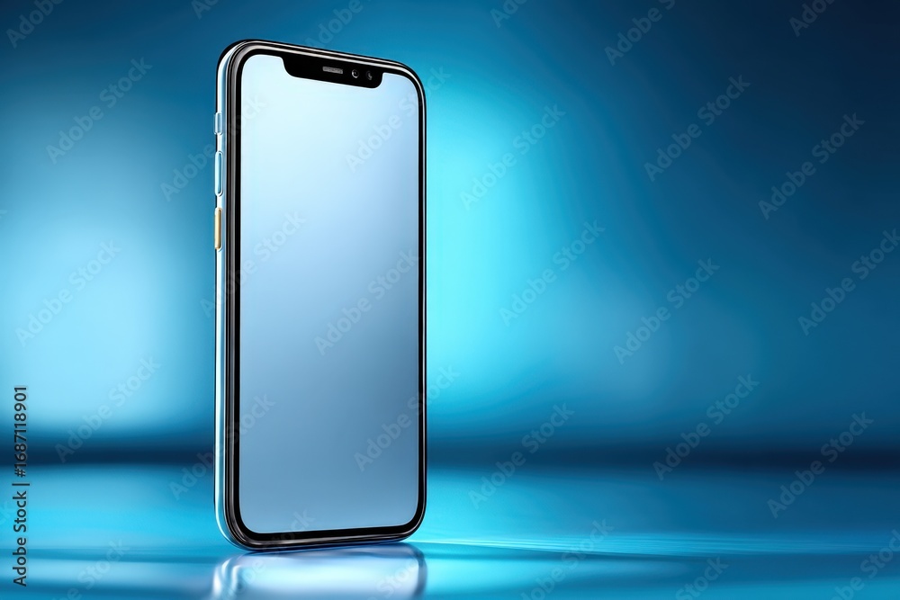 Smartphone with blank screen, standing in lower left position, against a blurred blue gradient background, product shot, clean, modern, minimalist, mockup #1687118901