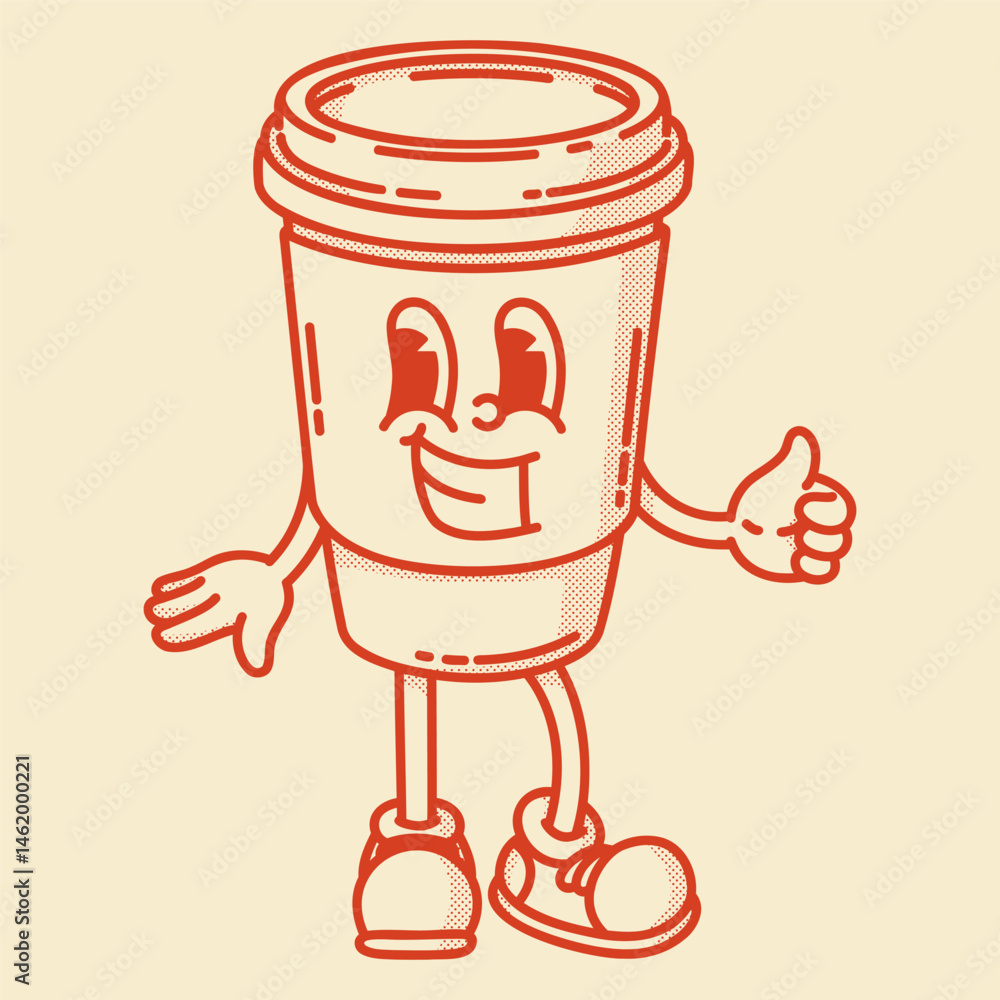 Smiling friendly coffe to go character mascot in shoes. Coffee shop mascot symbol. Hands up, finger up #1462000221