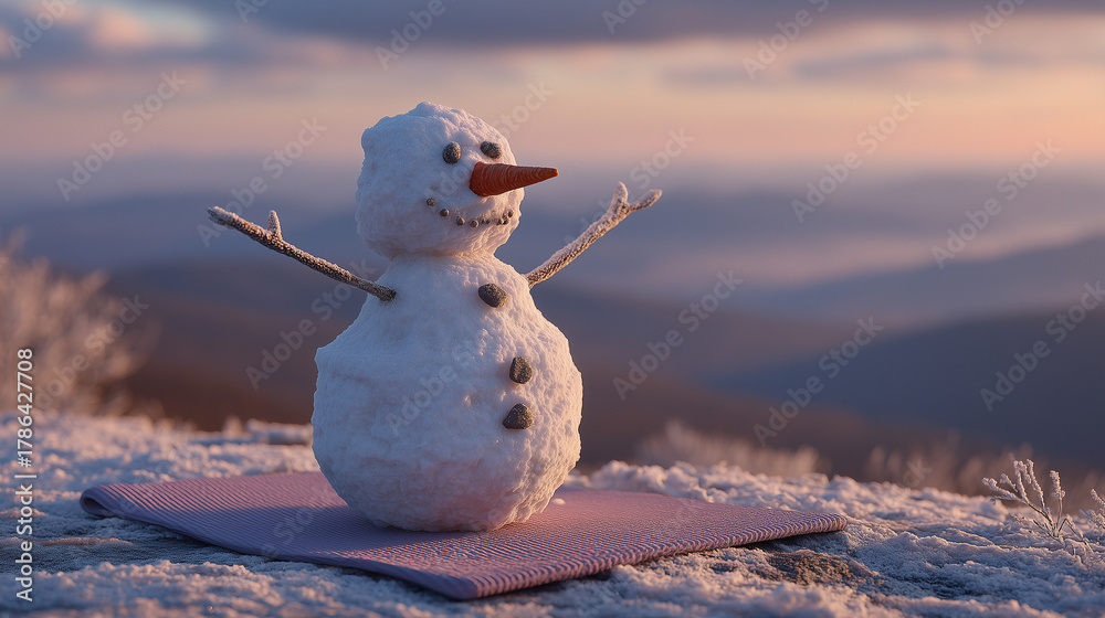 Snowman Practicing Yoga on a Frosty Mountain Top at Sunrise with a Scenic Horizon. Image made using Generative AI. #1786427708