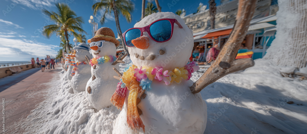Snowmen with sunglasses and colorful leis decorate a sunny Hawaii boardwalk, blending winter and summer in a playful and artistic scene. Image made using Generative AI. #1786450982