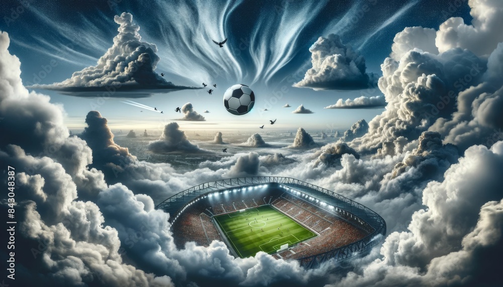 Soccer ball flying over stadium surrounded by clouds #843048387