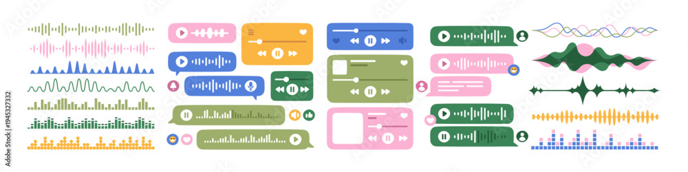 Sound waves, voice messages and audio tracks set. Music play and pause, soundtrack waveforms. Audible records, podcasts, players streaming. Flat vector illustrations isolated on white background #1945327332