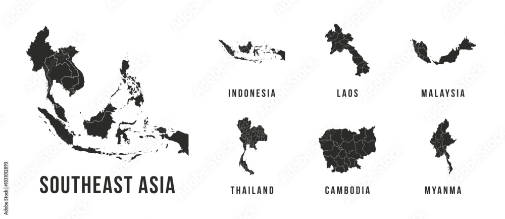Southeast Asia Map set. High quality Southeast Asia map. Indonesia, Laos, Malaysia, Thailand, Cambodia, Myanma maps. Vector illustration #1831012893