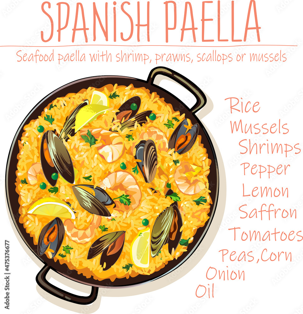 Spanish Paella plate with list of ingredients, vector illustration. #475376677