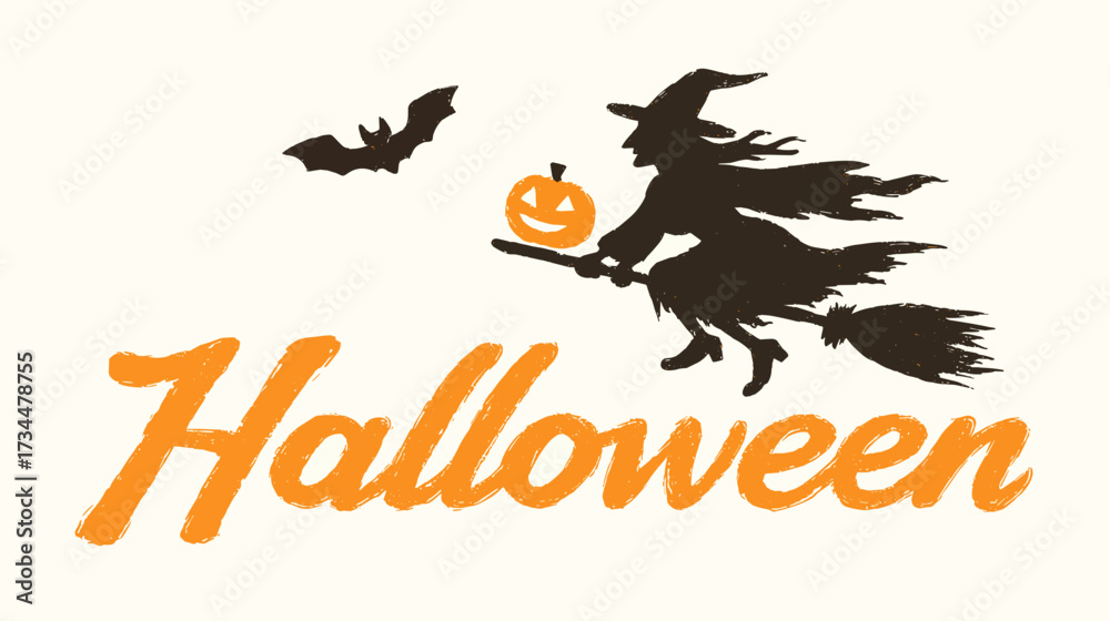 Spooky witch silhouette flying on broomstick holding pumpkin with bat above. Orange Halloween typography #1734478755