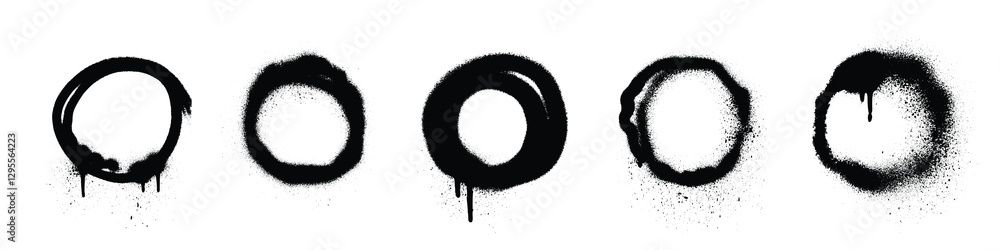 Spray paint circle collection with different graffiti effect styles. Black stencil rings with dripping and splattered, rough, solid and faded edge texture. Street art elements for urban designs. #1295564223