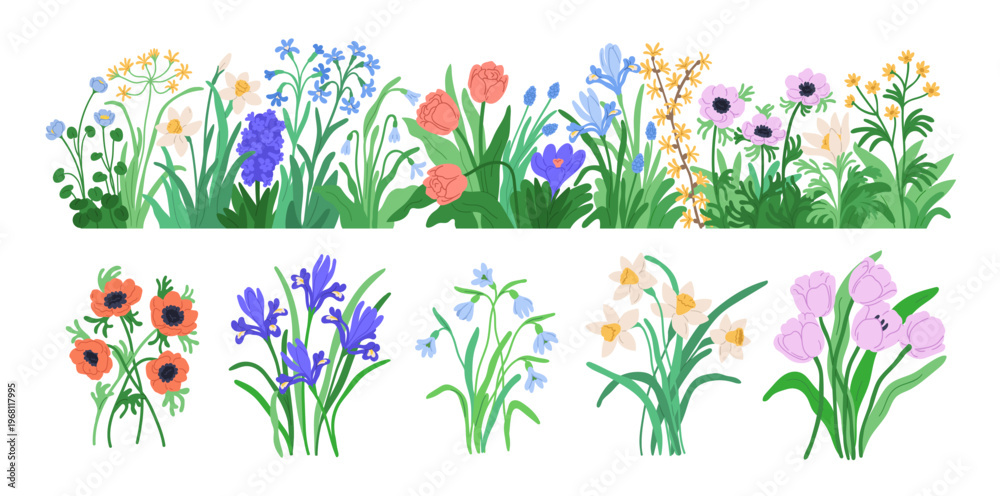 Spring floral blossoms set. Garden and field blooms, wildflowers. Summer plants, nature border decoration and anemone, daffodil, tulip bouquets. Flat vector illustrations isolated on white background #1968117995