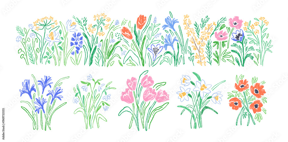 Spring flowers set. Doodle sketch style bloom, wildflower, blossom. Summer floral decoration and tulip, daffodil bouquets, crayon drawing. Hand-drawn vector illustrations isolated on white background #1969733555