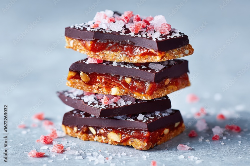 Stacked date and chocolate bark squares with sea salt and candy pieces, close up food still life with a grey backdrop, studio shot, artisan dessert #1672263032