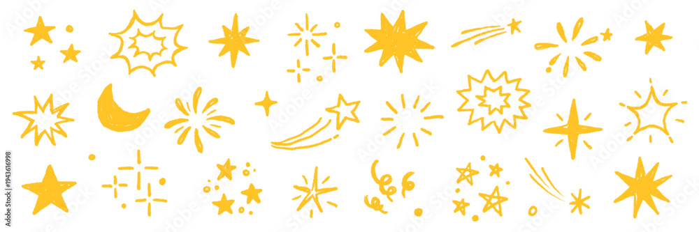 Star gold sticker icon collage set. Star icon sketch hand drawn line brush crayon texture vintage background. Cute kid magic twinkle sparkle, glow moon, space figure. Vector illustration #1943616998