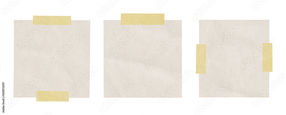 sticky notes, set of three blank vintage paper sheets taped with masking tape isolated on transparent background for scrapbook design notes memos or retro collage elements #1658170397