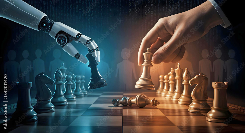 Strategic chess match between AI robotic hand and human symbolizing tech-driven decision making AI Agent AGI ASI #1542011420