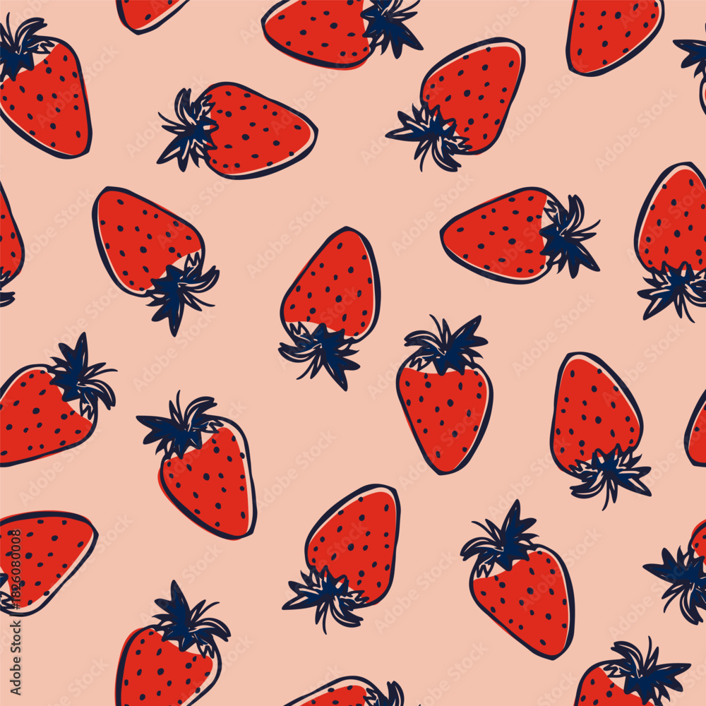Strawberry Seamless Pattern. Berries Vector Ornament Design Hand Drawn Style. Strawberry Wallpaper Template. Repeated Sweet Trendy Design for Fabric, Prints, Textile #1826080008