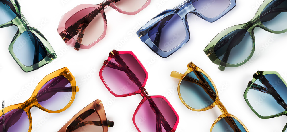 Sunglasses composition in many bright colors in transparent plastic. Top view with shadow. Trendy glasses isolated on white background. Glasses with polarized lenses. Fashionable eyewear for women. #521512726