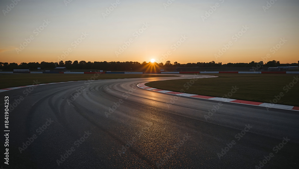 Sunset over a racetrack with tire marks on asphalt at dusk, motorsport background #1841904253