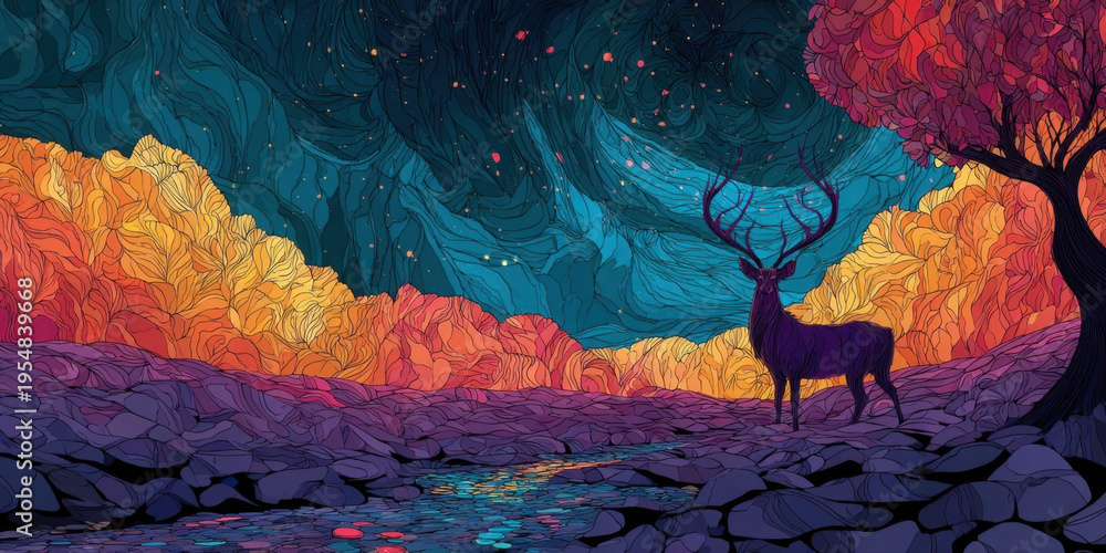 Surreal landscape with a large deer under a tree against a vibrant, stylized sky #1954839668