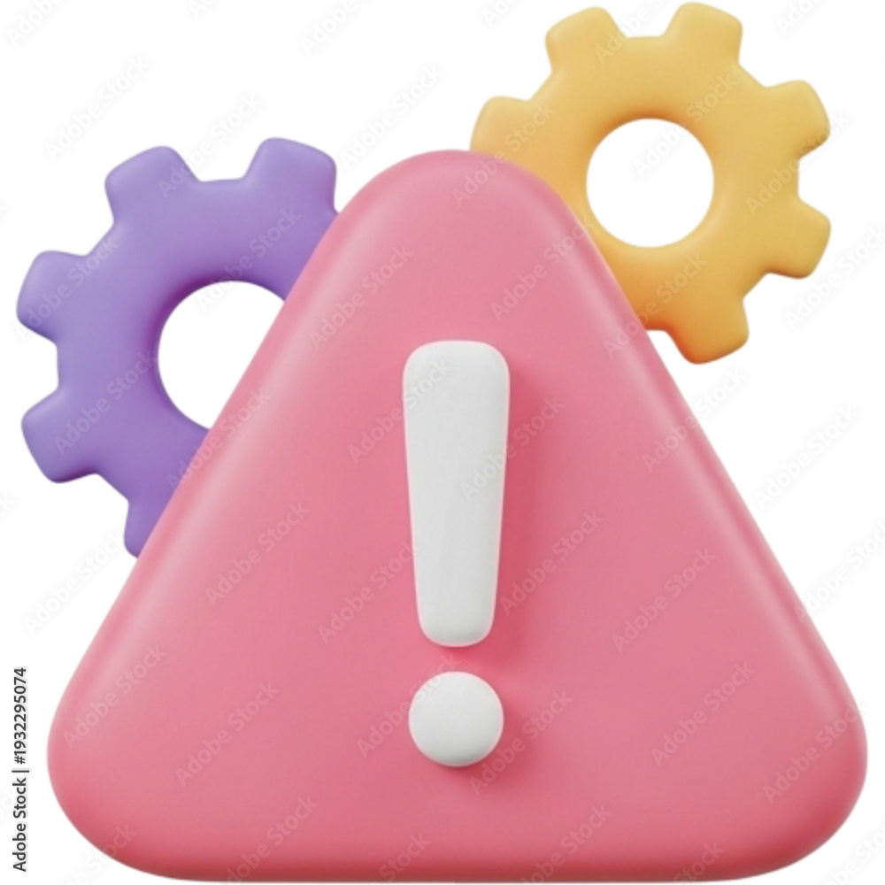 System Error Icon: A vibrant 3D rendering of an exclamation mark within a warning triangle, accompanied by cogwheels, suggesting a system issue. #1932295074