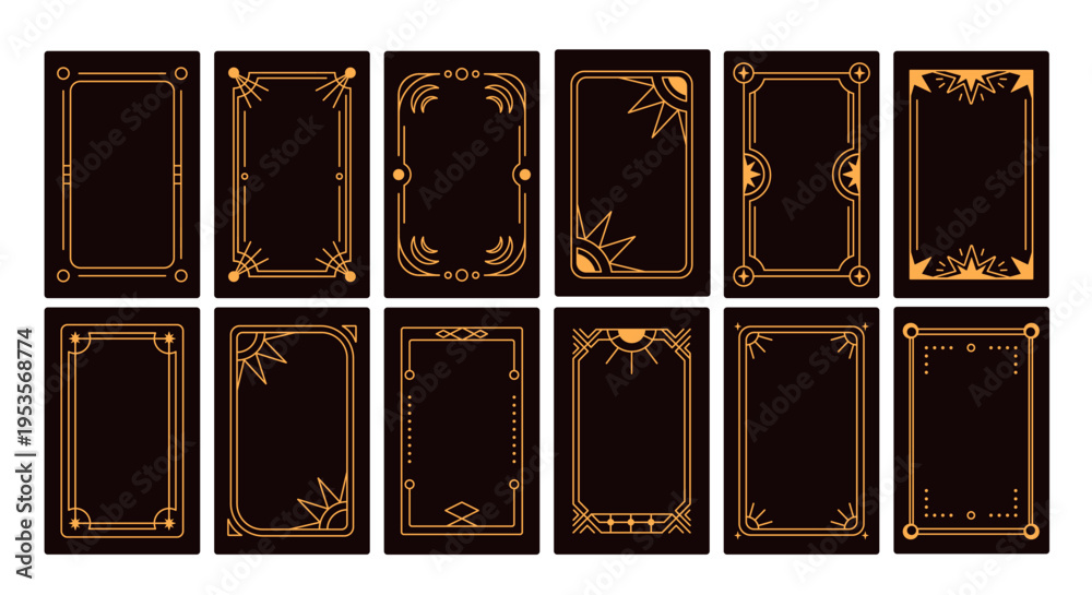 Tarot card frames, magic decorative borders. Taro back, reverse side designs set. Gold line corners with celestial mystic esoteric occult symbols and signs, sun, star. Flat vector illustrations #1953568774