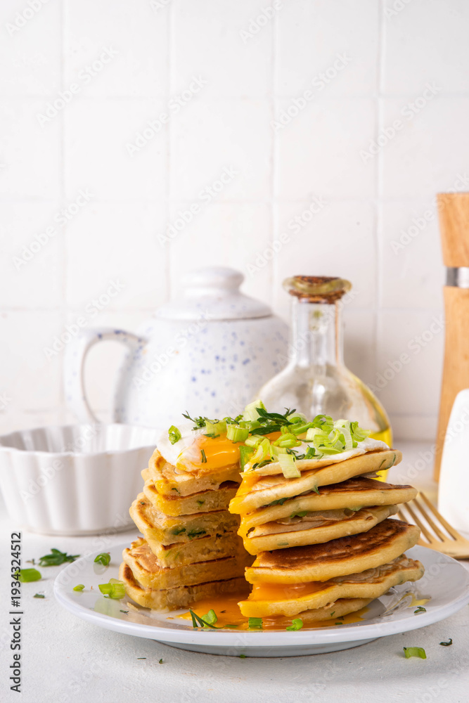 Tasty savory breakfast pancakes with spring green onion and fried eggs #1934324512