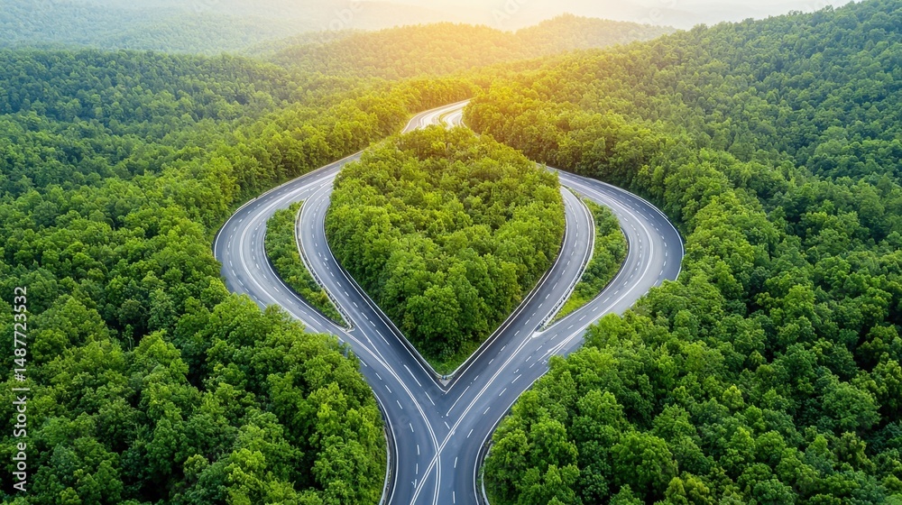 the aerial view shows a complex network of roads and interchanges converging and diverging at a major highway crossroad intersection #1487723532