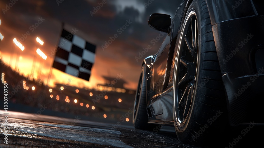 The checkered flag crossing the finish line of a Formula One car, motion blur #1088743758