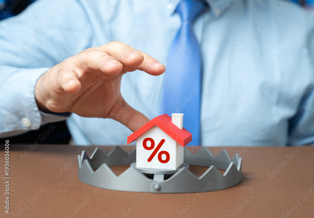The mortgage trap. Taking out a mortgage at a high interest rate illustrating debt burden financial pressure and housing affordability crisis. #1936056006