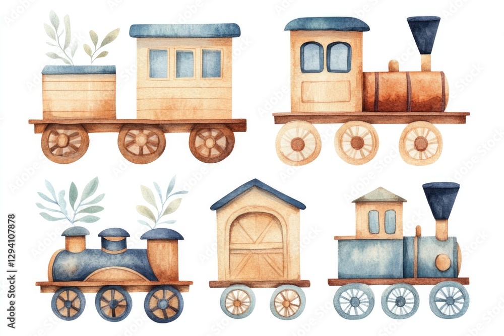 This collection of whimsical watercolor train illustrations combines playful designs with artistic detail, perfect for children's decor or creative projects inspired by transportation. #1294107878