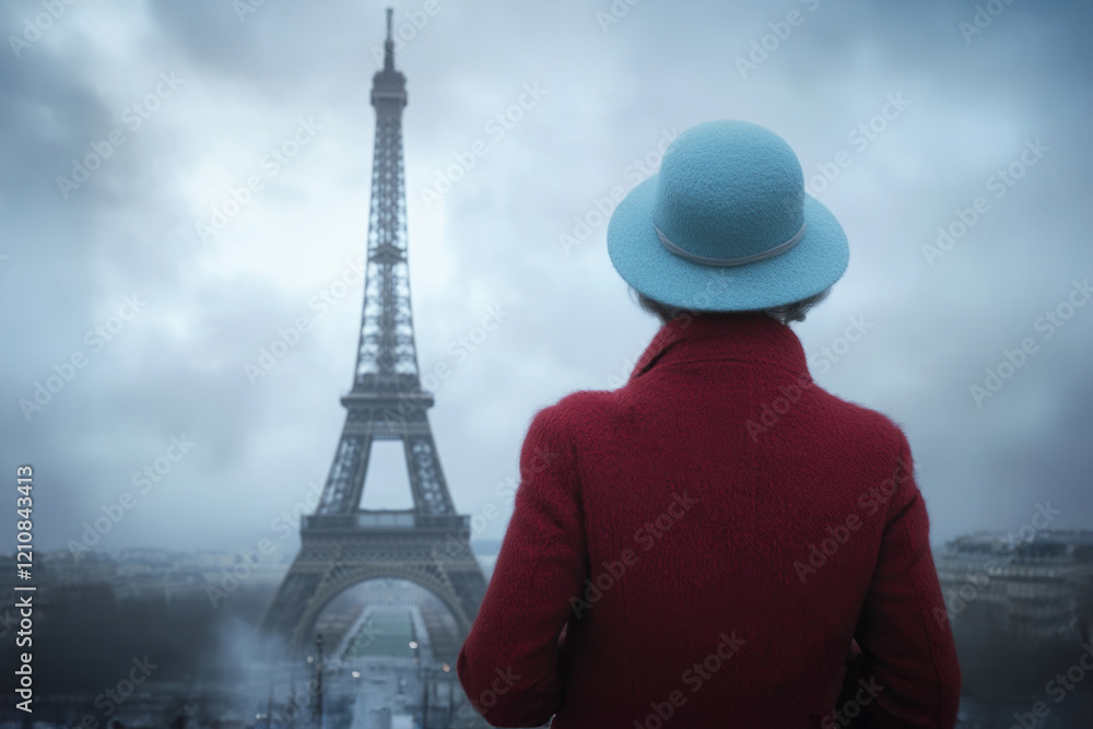 This evocative photograph shows a silhouette of a woman in a red coat, standing against the iconic Eiffel Tower, capturing the essence of Parisian romance and allure. #1210843413