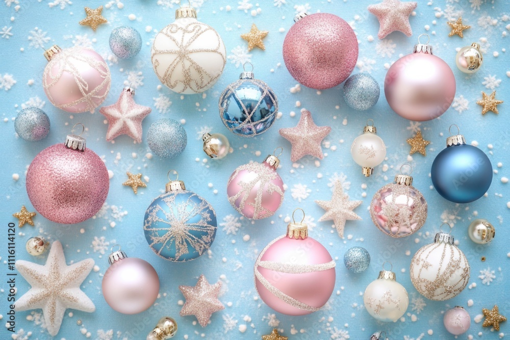This image presents assorted Christmas ornaments in pastel hues, artistically arranged on a snowy background, symbolizing elegance and festive decoration. #1116114120