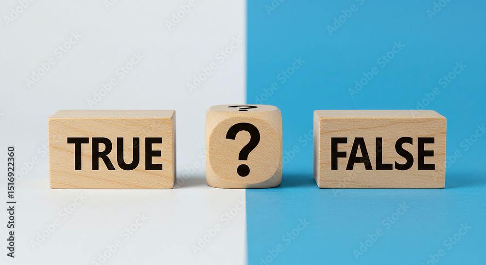 Three wooden blocks displaying true question mark and false on a split color background surface view #1516922360