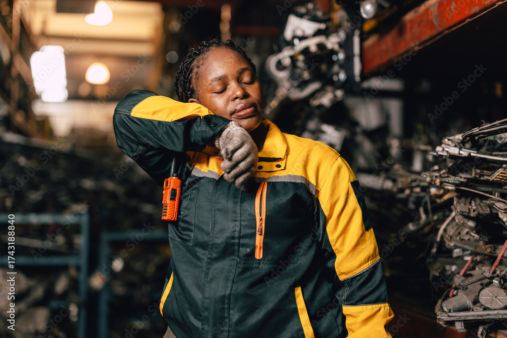 Tired fatigue exhausted engineer, sick worker, hard working sweat hot bad airflow workplace. #1743188840